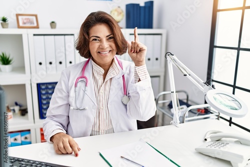 Middle age hispanic woman wearing doctor uniform and stethoscope at the clinic pointing finger up with successful idea. exited and happy. number one.