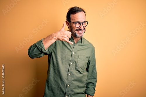 Middle age hoary man wearing casual green shirt and glasses over isolated yellow background smiling doing phone gesture with hand and fingers like talking on the telephone. Communicating concepts.