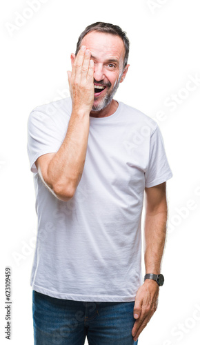 Middle age hoary senior man wearing white t-shirt over isolated background covering one eye with hand with confident smile on face and surprise emotion.