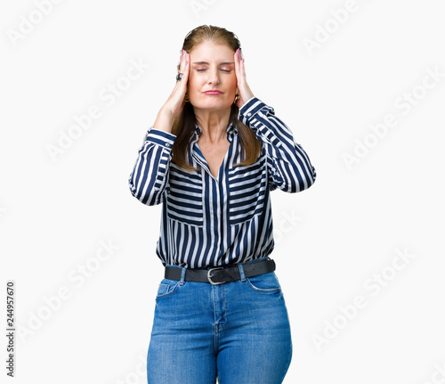Middle age mature business woman over isolated background with hand on head for pain in head because stress. Suffering migraine.
