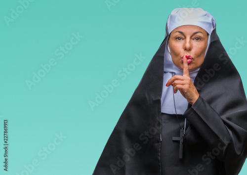 Middle age senior christian catholic nun woman over isolated background asking to be quiet with finger on lips. Silence and secret concept.