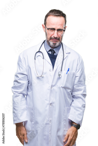 Middle age senior hoary doctor man wearing medical uniform isolated background depressed and worry for distress, crying angry and afraid. Sad expression.