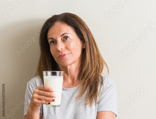 Middle age woman drinking a glass of fresh milk serious face thinking about question, very confused idea