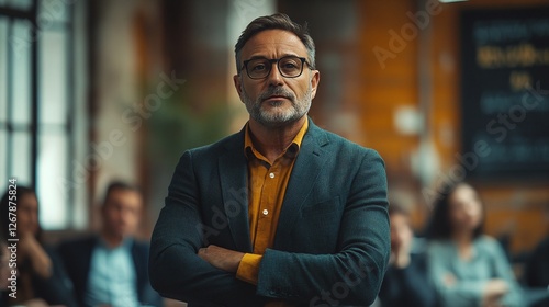 middle aged businessman giving a professional speech to employees in a corporate office meeting, business presentation speaker leading a workplace seminar with a group of people listening and learning