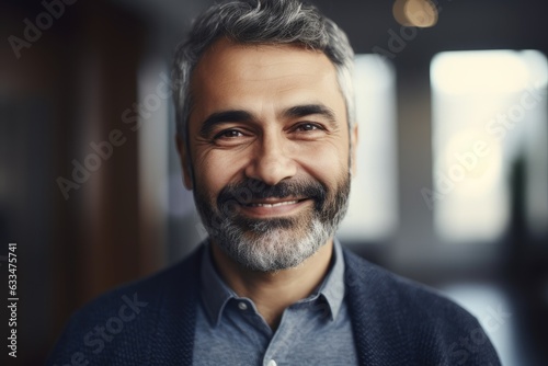 Middle aged businessman of arab ethnicity smiling in a modern office and looking at camera