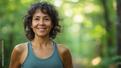 Middle aged hispanic woman jogging on a forest trail, summer time. Healthy outdoor activity. Sports activity outdoors, in green forest. Elderly South American woman jogging outdoors. Cardio exercising