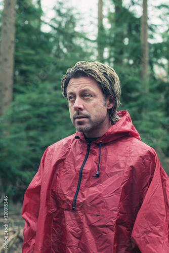 Middle aged man in red raincoat in forest.