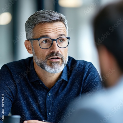 man, meeting, goggles, business, conversation, corporate, office, work, communication, professional, adult, middle-aged, male, executive, grey hair, beard, discussion, talking, looking, serious, employee, company, success, leadership, confidence, strategy, plan
