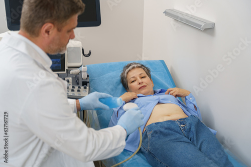 Middle aged woman patient lying on bed and having ultrasound examination of abdomen in clinic
