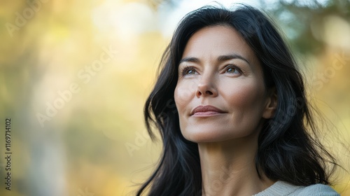 Middle aged woman with dark hair, wearing casual clothing, looking thoughtfully into the distance, blurred natural background, soft natural light, minimalistic style