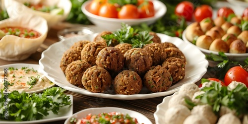 Middle Eastern dinner party with traditional dishes like falafel kebap and hummus. Concept Middle Eastern Cuisine, Traditional Dishes, Dinner Party Ideas, Foodie Inspiration