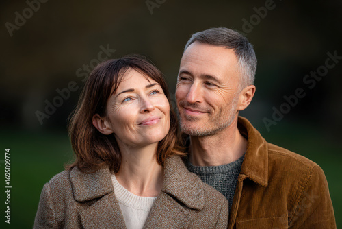 middle-aged, couple, embrace, warmly, park, during, cosy, autumn, day, love, wearing, comfortable, stylish, outerwear, they, share, tender, gaze, reflect, confidence, deep, affection, 1, another, nestled, among, crisp, fallen, leaf, warmth, intimacy, against, clean, background, soft, gold, sunlight, filter, through, tree, illuminating, joyful, expression