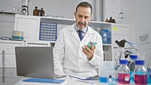 Middle-aged grey-haired professional unlocking modern science with his laptop and smartphone in a tech-laden laboratory