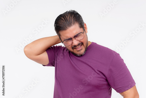 pain, neck, man, discomfort, adult, health, expression, injury, grimace, muscle, problem, ache, stress, filtered, medicals, tension, male, treatment, therapy, painfully, chronic, disease, physical, hand, goggles, portrait, casual attire, white background, one person, person, people, mature, middle-aged, health care, unwell, latin, isolated, cephalalgia, body language, guy, facial hair, hispanic, latino