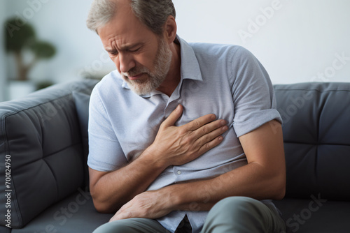Middle-aged man with pain holding hand to chest. Concept for heartache or cardiac arrest