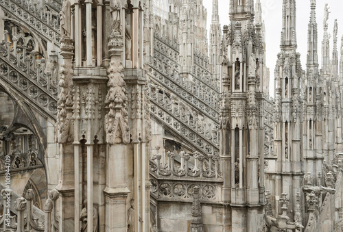 Milan cathedral roof gothic ornaments spire pointed arches statues marble