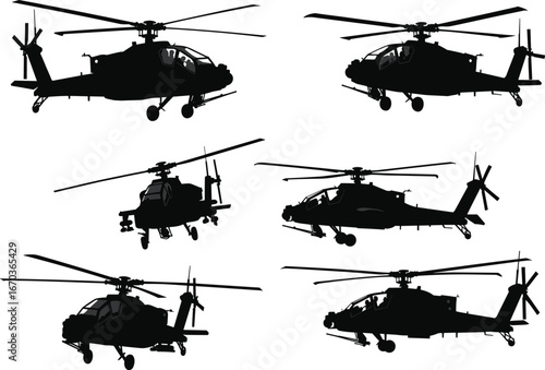Military attack helicopter vector set with aviation silhouettes, rotor blades, defense aircraft, combat chopper illustrations, and war aviation design for tactical use
