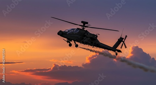Military Black Helicopter Flying in Sunset Sky with Smoke Trail