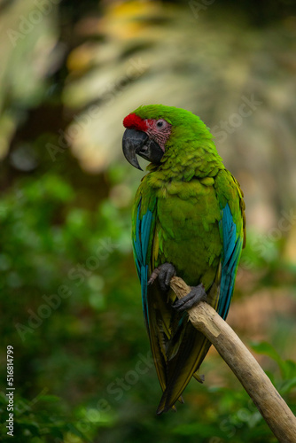 Military macaw, close up, head, details, beautiful big bird, parrot of Latin America, green color, rare bird, tropical, exotic bird, sitting on a tree, red tail, jungles, Colombia