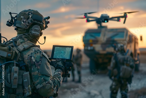 military, drone, technology, sunset, soldier, operation, vehicle, communication, surveillance, battlefield, teamwork, equipment, remote control, reconnaissance, strategy, defense, armed forces, mission, landscape, action, training, innovation, security, combat, coordination, high technology, environment, aerial, monitoring, advanced, deployment, logistic, engagement, readiness, precision, intelligence, operated, safety, support, field, command, control, visual
