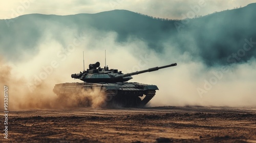 tank, military, vehicle, warfare, army, combat, armored, weapon, battle, war, destruction, power, force, defense, attack, smoke, dust, ground, field, landscape, mountain, sky, horizon, cloudy, fog, silhouette, steel, metal, track, wheel, turret, cannon, gun, camouflage, driving, movement, motion, speed, action, machinery, technology, operated, maneuvering, forceful, dynamic