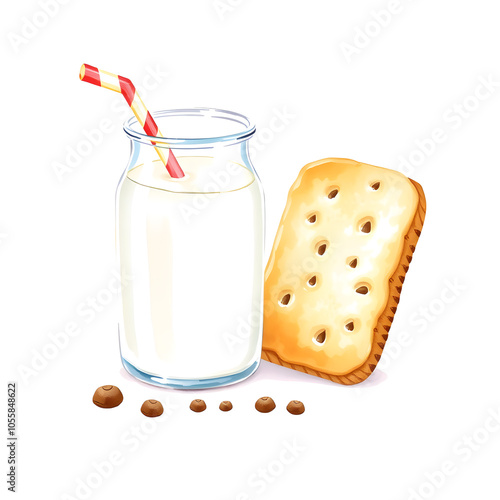 Milk and biscuit, watercolor illustration on white background. Generative AI