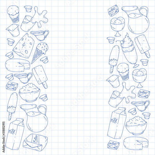 Milk, butter, cottage cheese, sour cream, cheese, yogurt, ice cream, cream. Vector pattern. Collection of dairy products.