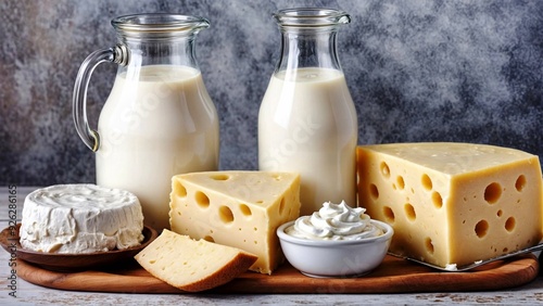 Milk, sour cream and cheese on the table. A wide variety of dairy products on the table