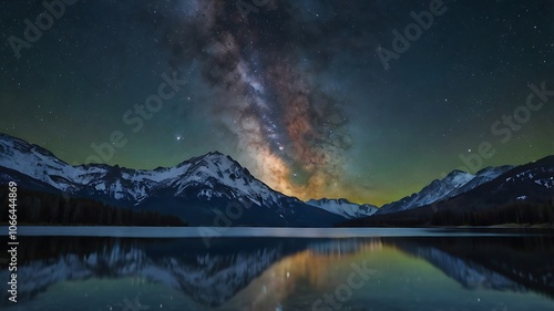 night, sky, lactic, way, galaxy, star, star, mountain, mountain, snow, lake, water, still, calm, dark, blue, green, yellow, orange, nature, landscape, scenic, beauty, peaceful, tranquil, serene, wilderness, remote, majestic, huge, universe, space, celestial, awe, wonder, magical, aethereal, dreamlike