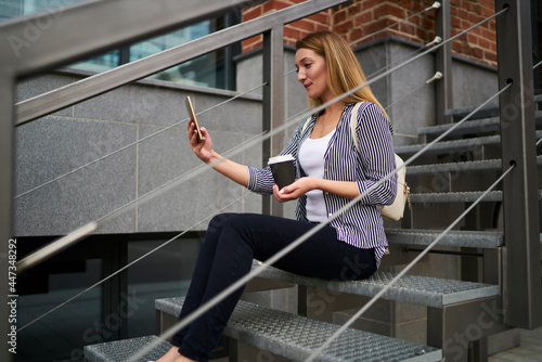 Millennial generation Z with takeaway coffee to go shooting video vlog during leisure time in city, beautiful female tourist using cellular technology for connecting to 4g and make online translation