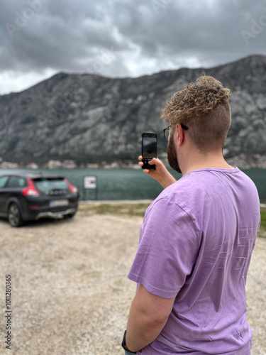 Millennial man standing by a car and take photo on smartphone, capturing the scenic view of a mountain range with his camera phone for social networks blog. Cloudy skies enhance the dramatic