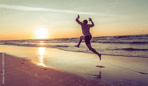 Millennials man jumping on the beach. Active vacation concept. Fashion for a healthy lifestyle. Sunset by the sea.