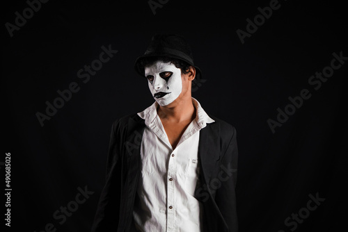 mime, art, artist, acting, actor, adult, artistic, background, black, character, circus, clothes, clown, comedian, comedy, concept, copy space, drama, emotion, entertainer, entertainment, expression, face, gesticulate, glove, guy, hat, humorous, isolated, lifestyle, looking, make-up, male, man, mask, mimic, people, performance, performing, person, portrait, pose, posing, single, standing, studio, white, young