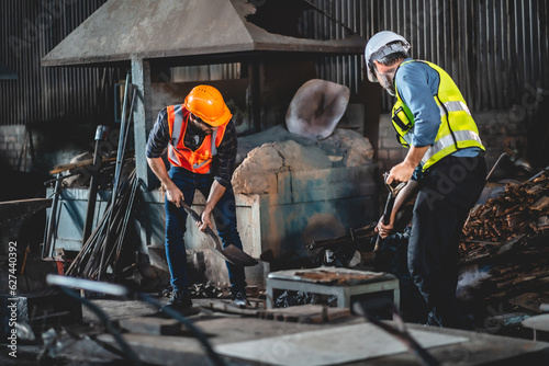 Mine worker man dressed in work overalls and a hard hat, Work in a coal mine, Plant worker throws coal into open-hearth melting furnace, working in coal mine factory and warehouse using spade to move