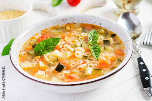 Minestrone, italian vegetable soup with pasta on white table. Vegan soup.