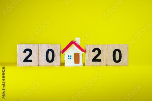 Mini house on wooden block year 2020 using as property real estate concept - Yellow background