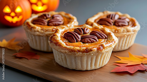 Mini Pumpkin Pecan Pies on Wooden Board with Autumn Leaves and Jack-o'-lanterns