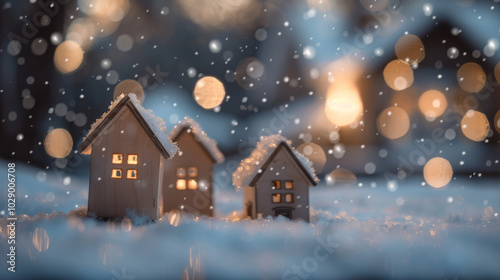 Miniature Christmas houses and trees with snow, New Year holiday greeting concept