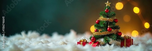 Miniature Christmas tree with presents and golden garland on a fluffy carpet, fluffy, holiday decoration