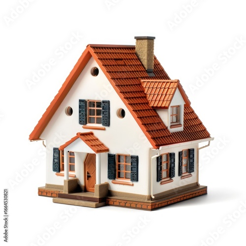 miniature, house, model, home, building, property, real estate, terracotta, roof, white, wall, shutter, black, porch, front, exterior, design, architecture, dwelling, residence, family, small, scaled, three-dimensional, realistic, isolated, white background, gable, window, chimney, step, homeowner, investment, style, charming, cute, traditional, modern, vintage, classic, cosy