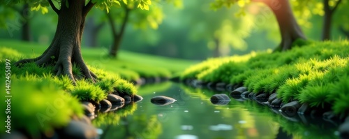 Miniature forest with tiny bushes, grass, and a tranquil pond, background, green