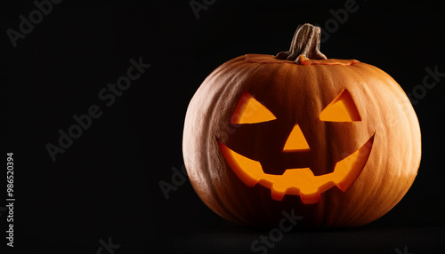 Miniature Jack O Lantern face for Halloween isolated on black. Carved pumpkin in dark night. Holiday