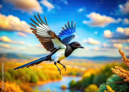 magpie, bird, flight, blue skies, miniature, diorama, photo, bokeh, aerial view, avian, wildlife, nature, animal, feather, wing, flying, sky, cloud, landscape, hi-res, realistic, detailed, sharp, vibrant, colours, beautiful, image, picture, photo, artwork, digital artwork