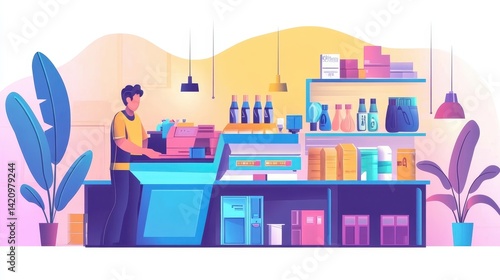 minimal, concept, technician, operating, horizontal, extrusion, press, soft, gradient, shop, raw, style, ar, design, profile, v, illustration, cartoon, job, interior, vector, background, id, flat, people, business, retail, food, supermarket, store, woman, grocery, market, female, bakery, purchase, drink, character, counter, work, bar, room, buy, mall, modern, banner, inside, shelf, product