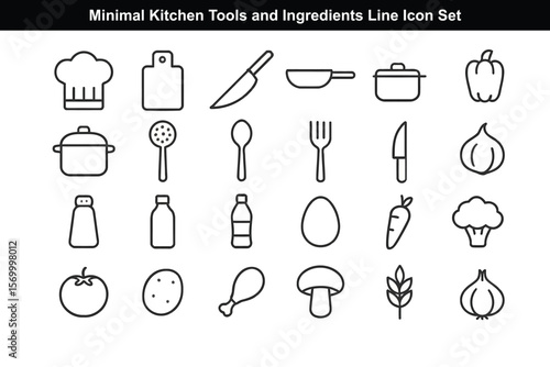 Minimal Kitchen Tools and Ingredients Line Icon Set
