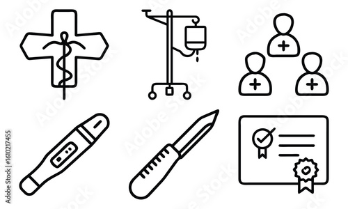 Minimal Medical Line Icons Set – Hospital, Surgery, Thermometer, IV Drip, Healthcare Team, and Certification Vector Symbols for Health Apps, Web Design, and Infographics