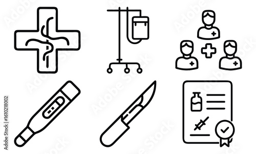 Minimal Medical Line Icons Set – Hospital, Surgery, Thermometer, IV Drip, Healthcare Team, and Certification Vector Symbols for Health Apps, Web Design, and Infographics