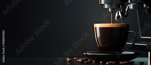Minimal mockup with coffee brewing at coffee machine on black background. Pouring espresso. Coffee shop, cafe illustration. Copy space. Generative ai