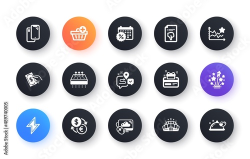 Minimal set of Add purchase, Cloud computing and Breathable mattress flat icons for web development. Energy, Pay money, Journey icons. Fireworks stars, Smartphone, Arena stadium web elements. Vector