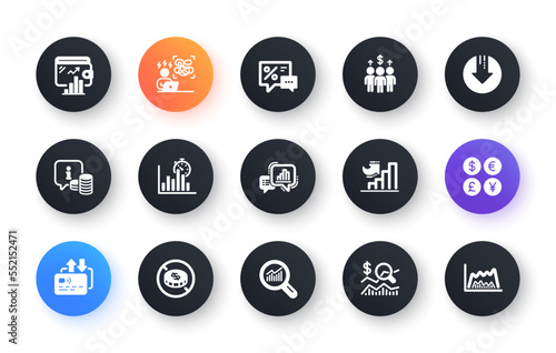 Minimal set of Download arrow, Card and Graph chart flat icons for web development. Growth chart, Wallet, Report timer icons. Discounts, Money currency, Info web elements. Data analysis. Vector